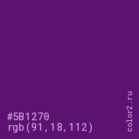 Цвет #5B1270 в цветовой модели RGB обозначается тремя октетами (91, 18, 112) в десятичном формате и #5B1270 в шестнадцатиричном (hex) формате, которые являются интенсивностью красного 91 (hex 5B), интенсивность зелёного 18 (hex 12) и интенсивность синего 112 (hex 70).
