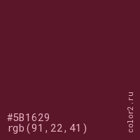Цвет #5B1629 в цветовой модели RGB обозначается тремя октетами (91, 22, 41) в десятичном формате и #5B1629 в шестнадцатиричном (hex) формате, которые являются интенсивностью красного 91 (hex 5B), интенсивность зелёного 22 (hex 16) и интенсивность синего 41 (hex 29).