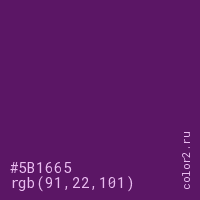 Цвет #5B1665 в цветовой модели RGB обозначается тремя октетами (91, 22, 101) в десятичном формате и #5B1665 в шестнадцатиричном (hex) формате, которые являются интенсивностью красного 91 (hex 5B), интенсивность зелёного 22 (hex 16) и интенсивность синего 101 (hex 65).