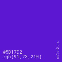 Цвет #5B17D2 в цветовой модели RGB обозначается тремя октетами (91, 23, 210) в десятичном формате и #5B17D2 в шестнадцатиричном (hex) формате, которые являются интенсивностью красного 91 (hex 5B), интенсивность зелёного 23 (hex 17) и интенсивность синего 210 (hex D2).
