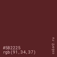 Цвет #5B2225 в цветовой модели RGB обозначается тремя октетами (91, 34, 37) в десятичном формате и #5B2225 в шестнадцатиричном (hex) формате, которые являются интенсивностью красного 91 (hex 5B), интенсивность зелёного 34 (hex 22) и интенсивность синего 37 (hex 25).