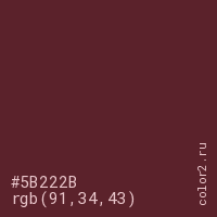 Цвет #5B222B в цветовой модели RGB обозначается тремя октетами (91, 34, 43) в десятичном формате и #5B222B в шестнадцатиричном (hex) формате, которые являются интенсивностью красного 91 (hex 5B), интенсивность зелёного 34 (hex 22) и интенсивность синего 43 (hex 2B).