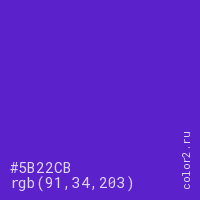 Цвет #5B22CB в цветовой модели RGB обозначается тремя октетами (91, 34, 203) в десятичном формате и #5B22CB в шестнадцатиричном (hex) формате, которые являются интенсивностью красного 91 (hex 5B), интенсивность зелёного 34 (hex 22) и интенсивность синего 203 (hex CB).