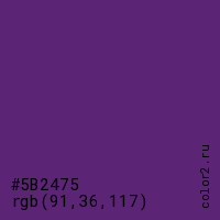 Цвет #5B2475 в цветовой модели RGB обозначается тремя октетами (91, 36, 117) в десятичном формате и #5B2475 в шестнадцатиричном (hex) формате, которые являются интенсивностью красного 91 (hex 5B), интенсивность зелёного 36 (hex 24) и интенсивность синего 117 (hex 75).