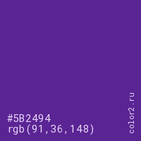 Цвет #5B2494 в цветовой модели RGB обозначается тремя октетами (91, 36, 148) в десятичном формате и #5B2494 в шестнадцатиричном (hex) формате, которые являются интенсивностью красного 91 (hex 5B), интенсивность зелёного 36 (hex 24) и интенсивность синего 148 (hex 94).