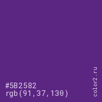 Цвет #5B2582 в цветовой модели RGB обозначается тремя октетами (91, 37, 130) в десятичном формате и #5B2582 в шестнадцатиричном (hex) формате, которые являются интенсивностью красного 91 (hex 5B), интенсивность зелёного 37 (hex 25) и интенсивность синего 130 (hex 82).