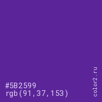 Цвет #5B2599 в цветовой модели RGB обозначается тремя октетами (91, 37, 153) в десятичном формате и #5B2599 в шестнадцатиричном (hex) формате, которые являются интенсивностью красного 91 (hex 5B), интенсивность зелёного 37 (hex 25) и интенсивность синего 153 (hex 99).