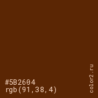 Цвет #5B2604 в цветовой модели RGB обозначается тремя октетами (91, 38, 4) в десятичном формате и #5B2604 в шестнадцатиричном (hex) формате, которые являются интенсивностью красного 91 (hex 5B), интенсивность зелёного 38 (hex 26) и интенсивность синего 4 (hex 04).
