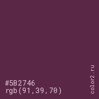 Цвет #5B2746 в цветовой модели RGB обозначается тремя октетами (91, 39, 70) в десятичном формате и #5B2746 в шестнадцатиричном (hex) формате, которые являются интенсивностью красного 91 (hex 5B), интенсивность зелёного 39 (hex 27) и интенсивность синего 70 (hex 46).