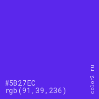 Цвет #5B27EC в цветовой модели RGB обозначается тремя октетами (91, 39, 236) в десятичном формате и #5B27EC в шестнадцатиричном (hex) формате, которые являются интенсивностью красного 91 (hex 5B), интенсивность зелёного 39 (hex 27) и интенсивность синего 236 (hex EC).