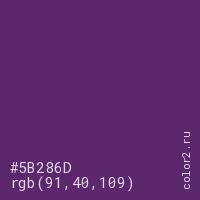 Цвет #5B286D в цветовой модели RGB обозначается тремя октетами (91, 40, 109) в десятичном формате и #5B286D в шестнадцатиричном (hex) формате, которые являются интенсивностью красного 91 (hex 5B), интенсивность зелёного 40 (hex 28) и интенсивность синего 109 (hex 6D).