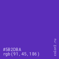 Цвет #5B2DBA в цветовой модели RGB обозначается тремя октетами (91, 45, 186) в десятичном формате и #5B2DBA в шестнадцатиричном (hex) формате, которые являются интенсивностью красного 91 (hex 5B), интенсивность зелёного 45 (hex 2D) и интенсивность синего 186 (hex BA).