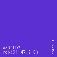 Цвет #5B2FD2 в цветовой модели RGB обозначается тремя октетами (91, 47, 210) в десятичном формате и #5B2FD2 в шестнадцатиричном (hex) формате, которые являются интенсивностью красного 91 (hex 5B), интенсивность зелёного 47 (hex 2F) и интенсивность синего 210 (hex D2).