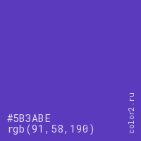 Цвет RGB(91, 58, 190) в процентом отношении количества цвета состоит из 35.7% красного (red), 22.7% зелёного (green) и 74.5% синего (blue).