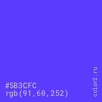 Цвет #5B3CFC в цветовой модели RGB обозначается тремя октетами (91, 60, 252) в десятичном формате и #5B3CFC в шестнадцатиричном (hex) формате, которые являются интенсивностью красного 91 (hex 5B), интенсивность зелёного 60 (hex 3C) и интенсивность синего 252 (hex FC).