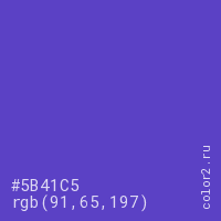 Цвет #5B41C5 в цветовой модели RGB обозначается тремя октетами (91, 65, 197) в десятичном формате и #5B41C5 в шестнадцатиричном (hex) формате, которые являются интенсивностью красного 91 (hex 5B), интенсивность зелёного 65 (hex 41) и интенсивность синего 197 (hex C5).