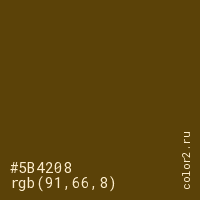 Цвет #5B4208 в цветовой модели RGB обозначается тремя октетами (91, 66, 8) в десятичном формате и #5B4208 в шестнадцатиричном (hex) формате, которые являются интенсивностью красного 91 (hex 5B), интенсивность зелёного 66 (hex 42) и интенсивность синего 8 (hex 08).