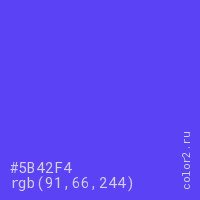Цвет #5B42F4 в цветовой модели RGB обозначается тремя октетами (91, 66, 244) в десятичном формате и #5B42F4 в шестнадцатиричном (hex) формате, которые являются интенсивностью красного 91 (hex 5B), интенсивность зелёного 66 (hex 42) и интенсивность синего 244 (hex F4).