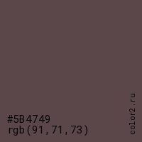 Цвет #5B4749 в цветовой модели RGB обозначается тремя октетами (91, 71, 73) в десятичном формате и #5B4749 в шестнадцатиричном (hex) формате, которые являются интенсивностью красного 91 (hex 5B), интенсивность зелёного 71 (hex 47) и интенсивность синего 73 (hex 49).