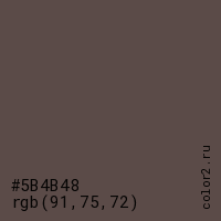 Цвет #5B4B48 в цветовой модели RGB обозначается тремя октетами (91, 75, 72) в десятичном формате и #5B4B48 в шестнадцатиричном (hex) формате, которые являются интенсивностью красного 91 (hex 5B), интенсивность зелёного 75 (hex 4B) и интенсивность синего 72 (hex 48).