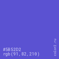 Цвет #5B52D2 в цветовой модели RGB обозначается тремя октетами (91, 82, 210) в десятичном формате и #5B52D2 в шестнадцатиричном (hex) формате, которые являются интенсивностью красного 91 (hex 5B), интенсивность зелёного 82 (hex 52) и интенсивность синего 210 (hex D2).