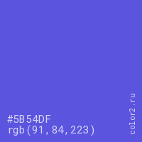 Цвет #5B54DF в цветовой модели RGB обозначается тремя октетами (91, 84, 223) в десятичном формате и #5B54DF в шестнадцатиричном (hex) формате, которые являются интенсивностью красного 91 (hex 5B), интенсивность зелёного 84 (hex 54) и интенсивность синего 223 (hex DF).