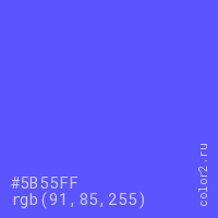 Цвет RGB(91, 85, 255) в процентом отношении количества цвета состоит из 35.7% красного (red), 33.3% зелёного (green) и 100% синего (blue).
