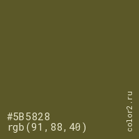 Цвет #5B5828 в цветовой модели RGB обозначается тремя октетами (91, 88, 40) в десятичном формате и #5B5828 в шестнадцатиричном (hex) формате, которые являются интенсивностью красного 91 (hex 5B), интенсивность зелёного 88 (hex 58) и интенсивность синего 40 (hex 28).