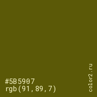 Цвет #5B5907 в цветовой модели RGB обозначается тремя октетами (91, 89, 7) в десятичном формате и #5B5907 в шестнадцатиричном (hex) формате, которые являются интенсивностью красного 91 (hex 5B), интенсивность зелёного 89 (hex 59) и интенсивность синего 7 (hex 07).