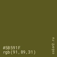 Цвет #5B591F в цветовой модели RGB обозначается тремя октетами (91, 89, 31) в десятичном формате и #5B591F в шестнадцатиричном (hex) формате, которые являются интенсивностью красного 91 (hex 5B), интенсивность зелёного 89 (hex 59) и интенсивность синего 31 (hex 1F).