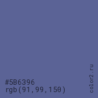 Цвет #5B6396 в цветовой модели RGB обозначается тремя октетами (91, 99, 150) в десятичном формате и #5B6396 в шестнадцатиричном (hex) формате, которые являются интенсивностью красного 91 (hex 5B), интенсивность зелёного 99 (hex 63) и интенсивность синего 150 (hex 96).
