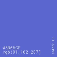 Цвет #5B66CF в цветовой модели RGB обозначается тремя октетами (91, 102, 207) в десятичном формате и #5B66CF в шестнадцатиричном (hex) формате, которые являются интенсивностью красного 91 (hex 5B), интенсивность зелёного 102 (hex 66) и интенсивность синего 207 (hex CF).