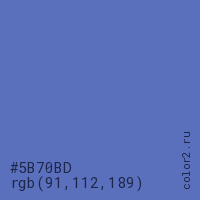 Цвет #5B70BD в цветовой модели RGB обозначается тремя октетами (91, 112, 189) в десятичном формате и #5B70BD в шестнадцатиричном (hex) формате, которые являются интенсивностью красного 91 (hex 5B), интенсивность зелёного 112 (hex 70) и интенсивность синего 189 (hex BD).