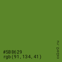 Цвет #5B8629 в цветовой модели RGB обозначается тремя октетами (91, 134, 41) в десятичном формате и #5B8629 в шестнадцатиричном (hex) формате, которые являются интенсивностью красного 91 (hex 5B), интенсивность зелёного 134 (hex 86) и интенсивность синего 41 (hex 29).