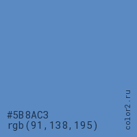 Цвет #5B8AC3 в цветовой модели RGB обозначается тремя октетами (91, 138, 195) в десятичном формате и #5B8AC3 в шестнадцатиричном (hex) формате, которые являются интенсивностью красного 91 (hex 5B), интенсивность зелёного 138 (hex 8A) и интенсивность синего 195 (hex C3).