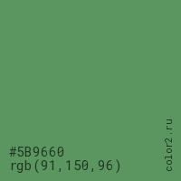 Цвет #5B9660 в цветовой модели RGB обозначается тремя октетами (91, 150, 96) в десятичном формате и #5B9660 в шестнадцатиричном (hex) формате, которые являются интенсивностью красного 91 (hex 5B), интенсивность зелёного 150 (hex 96) и интенсивность синего 96 (hex 60).