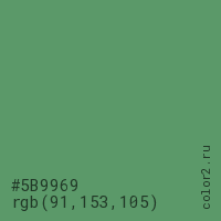 Цвет #5B9969 в цветовой модели RGB обозначается тремя октетами (91, 153, 105) в десятичном формате и #5B9969 в шестнадцатиричном (hex) формате, которые являются интенсивностью красного 91 (hex 5B), интенсивность зелёного 153 (hex 99) и интенсивность синего 105 (hex 69).