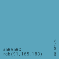 Цвет #5BA5BC в цветовой модели RGB обозначается тремя октетами (91, 165, 188) в десятичном формате и #5BA5BC в шестнадцатиричном (hex) формате, которые являются интенсивностью красного 91 (hex 5B), интенсивность зелёного 165 (hex A5) и интенсивность синего 188 (hex BC).