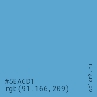 Цвет #5BA6D1 в цветовой модели RGB обозначается тремя октетами (91, 166, 209) в десятичном формате и #5BA6D1 в шестнадцатиричном (hex) формате, которые являются интенсивностью красного 91 (hex 5B), интенсивность зелёного 166 (hex A6) и интенсивность синего 209 (hex D1).