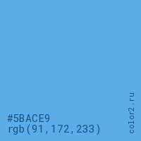 Цвет #5BACE9 в цветовой модели RGB обозначается тремя октетами (91, 172, 233) в десятичном формате и #5BACE9 в шестнадцатиричном (hex) формате, которые являются интенсивностью красного 91 (hex 5B), интенсивность зелёного 172 (hex AC) и интенсивность синего 233 (hex E9).