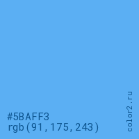 Цвет #5BAFF3 в цветовой модели RGB обозначается тремя октетами (91, 175, 243) в десятичном формате и #5BAFF3 в шестнадцатиричном (hex) формате, которые являются интенсивностью красного 91 (hex 5B), интенсивность зелёного 175 (hex AF) и интенсивность синего 243 (hex F3).