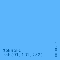 Цвет #5BB5FC в цветовой модели RGB обозначается тремя октетами (91, 181, 252) в десятичном формате и #5BB5FC в шестнадцатиричном (hex) формате, которые являются интенсивностью красного 91 (hex 5B), интенсивность зелёного 181 (hex B5) и интенсивность синего 252 (hex FC).