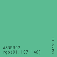 Цвет #5BBB92 в цветовой модели RGB обозначается тремя октетами (91, 187, 146) в десятичном формате и #5BBB92 в шестнадцатиричном (hex) формате, которые являются интенсивностью красного 91 (hex 5B), интенсивность зелёного 187 (hex BB) и интенсивность синего 146 (hex 92).