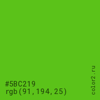 Цвет #5BC219 в цветовой модели RGB обозначается тремя октетами (91, 194, 25) в десятичном формате и #5BC219 в шестнадцатиричном (hex) формате, которые являются интенсивностью красного 91 (hex 5B), интенсивность зелёного 194 (hex C2) и интенсивность синего 25 (hex 19).