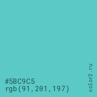 Цвет #5BC9C5 в цветовой модели RGB обозначается тремя октетами (91, 201, 197) в десятичном формате и #5BC9C5 в шестнадцатиричном (hex) формате, которые являются интенсивностью красного 91 (hex 5B), интенсивность зелёного 201 (hex C9) и интенсивность синего 197 (hex C5).
