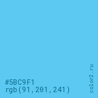 Цвет #5BC9F1 в цветовой модели RGB обозначается тремя октетами (91, 201, 241) в десятичном формате и #5BC9F1 в шестнадцатиричном (hex) формате, которые являются интенсивностью красного 91 (hex 5B), интенсивность зелёного 201 (hex C9) и интенсивность синего 241 (hex F1).