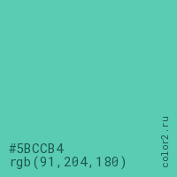 Цвет #5BCCB4 в цветовой модели RGB обозначается тремя октетами (91, 204, 180) в десятичном формате и #5BCCB4 в шестнадцатиричном (hex) формате, которые являются интенсивностью красного 91 (hex 5B), интенсивность зелёного 204 (hex CC) и интенсивность синего 180 (hex B4).