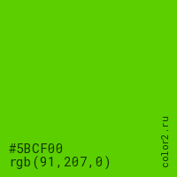 Цвет #5BCF00 в цветовой модели RGB обозначается тремя октетами (91, 207, 0) в десятичном формате и #5BCF00 в шестнадцатиричном (hex) формате, которые являются интенсивностью красного 91 (hex 5B), интенсивность зелёного 207 (hex CF) и интенсивность синего 0 (hex 00).