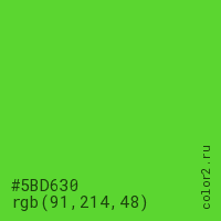 Цвет #5BD630 в цветовой модели RGB обозначается тремя октетами (91, 214, 48) в десятичном формате и #5BD630 в шестнадцатиричном (hex) формате, которые являются интенсивностью красного 91 (hex 5B), интенсивность зелёного 214 (hex D6) и интенсивность синего 48 (hex 30).
