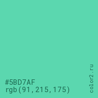 Цвет #5BD7AF в цветовой модели RGB обозначается тремя октетами (91, 215, 175) в десятичном формате и #5BD7AF в шестнадцатиричном (hex) формате, которые являются интенсивностью красного 91 (hex 5B), интенсивность зелёного 215 (hex D7) и интенсивность синего 175 (hex AF).